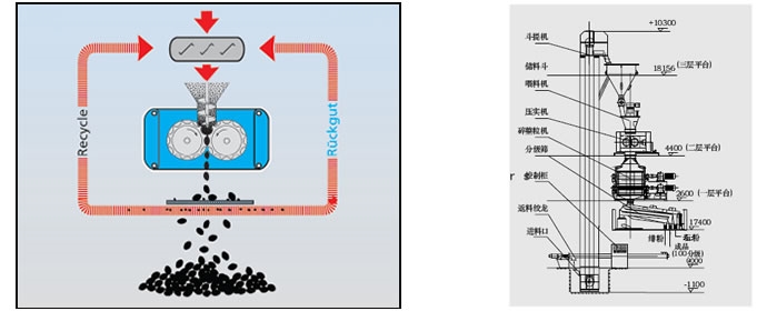 对辊式挤压造粒的工艺原理是:干物料在压力作用下团聚成致密坚硬的大块(饼料),称为挤压过程;饼料再被破碎筛分后成为颗粒料称为造粒过程。挤压的作用一是将颗粒间的空气挤掉,另外是使颗粒间距达到足够近,以产生如范德华力、吸附力、晶桥及内嵌连接等吸引力。挤压造粒的颗粒主要是靠分子之间的作用力形成的颗粒强度。