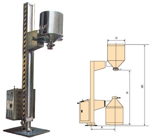 TJG 系列固定提升加料机由两部分组成,即提升机及底座。提升机由机架、液压提升系统及料门翻转机构组成。工作时,先将提升机的料门与料桶扣合,启动提升操作杆,料门与料桶一起上升,启动翻转操作杆,料桶即可番转180度,呈底桶向上姿态并移动到所需位置,利用料门上出料蝶阀,可很容易将物料加入所需的工艺设备中。